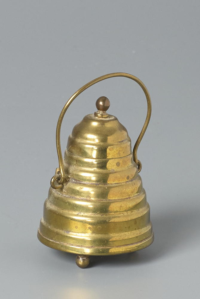 Vlakke bodem met drie bolpootjes, stijl verlopende geribde wand, hoog deksel met knop, twee ogen met gebogen hengsel.- Trefwoorden