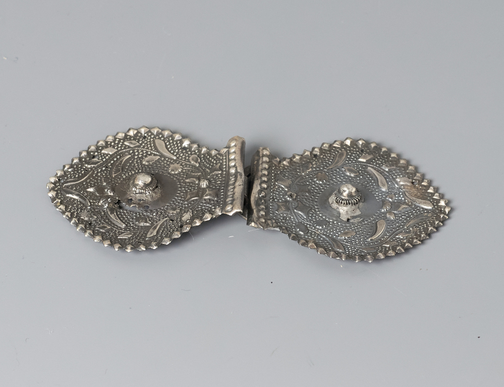 twee bladvormige stukken in dunzilver vol gedecoreerd met in het midden een Zeeuwse knop, de een moet oog de ander met een haak.- Trefwoorden