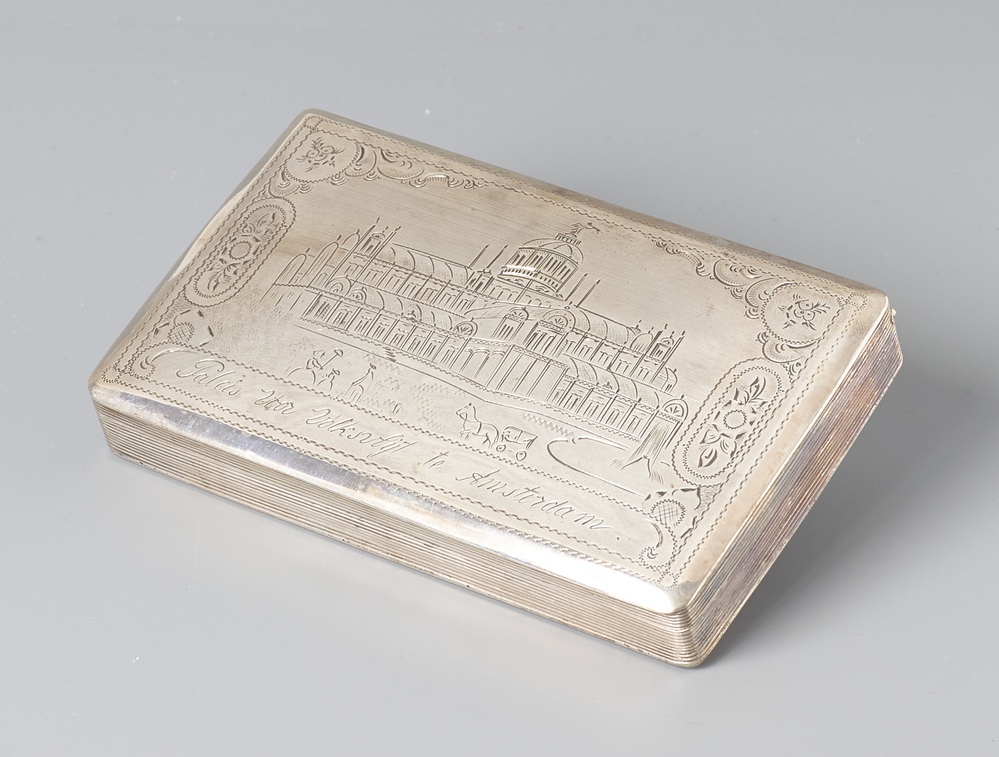 Rechthoekige dook met scharnierend deksel met een voorstelling van het Paleis voor de Volksvlijt. inscirptie aan de binnenzijde deksel: Gerhardus v.d. horst, 3 september 1897- Trefwoorden