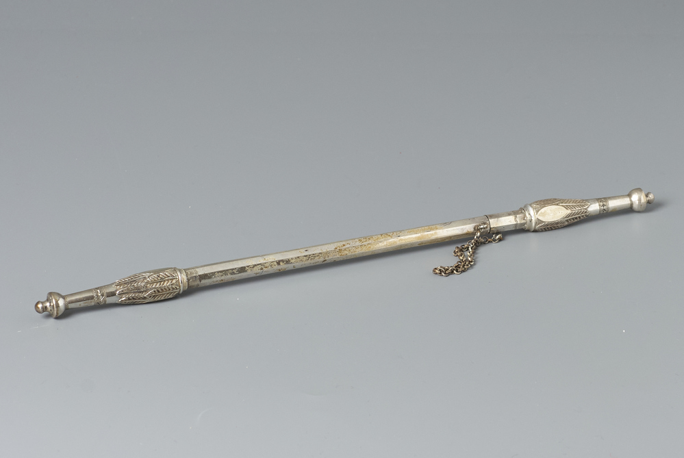 Houder achtkantig de uiteinden versierd met bladmotieven en een knop, de afneembare knop gezekerd met een korte ketting aan twee ogen.- Trefwoorden
