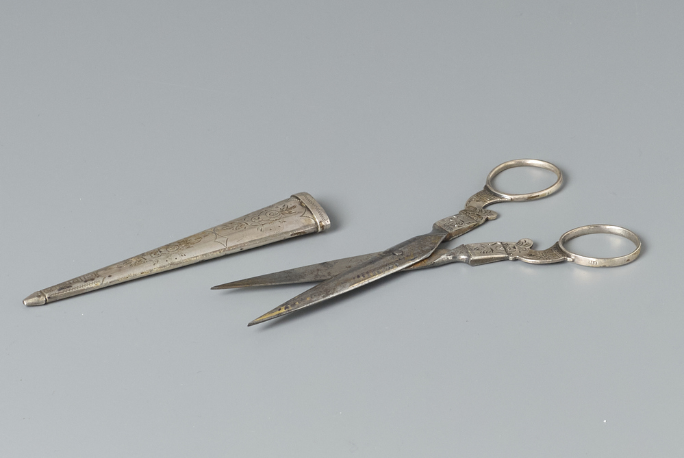 Kleine schaar met ijzeren spitse benen, zilveren armen en ogen met een zilveren schede gegraveerd met bloemmotieven.- Trefwoorden