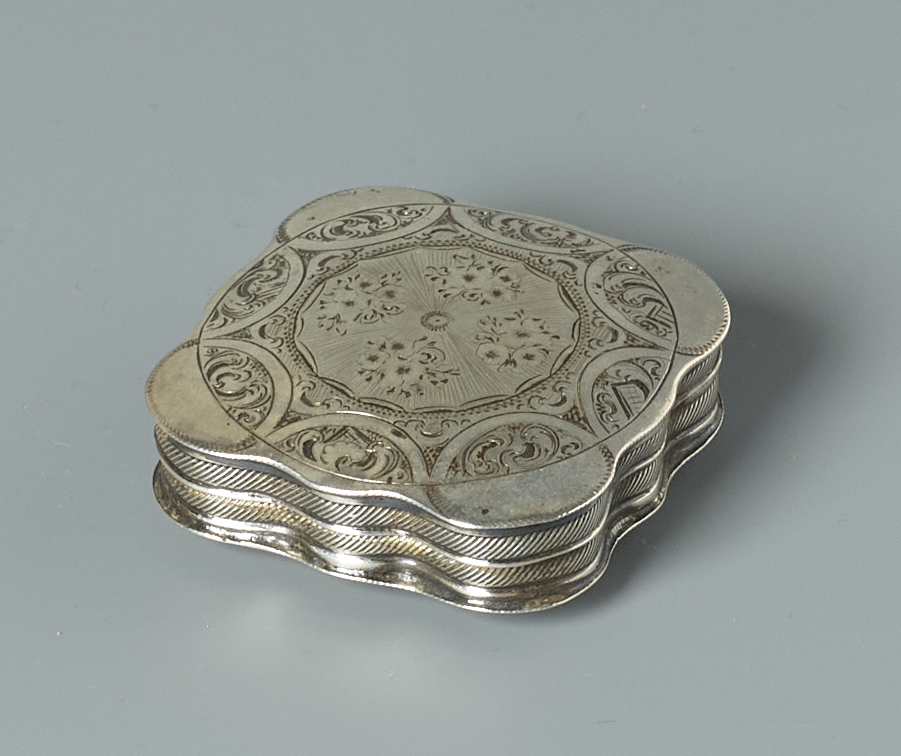 Gegolfde, vierkante pillendoos met scharnierend deksel- Trefwoorden