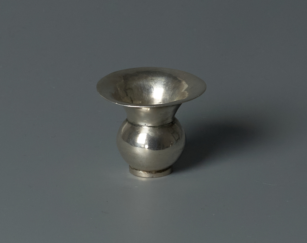 Kwispedoor met brede platte rand en staand op een voet.- Trefwoorden