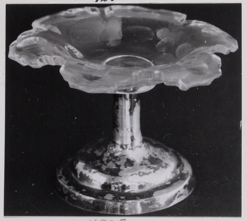 Platte kristallen coupe met olijfslijpsel op ronde gladde zilveren voet met gegraveerde rand.- Trefwoorden
