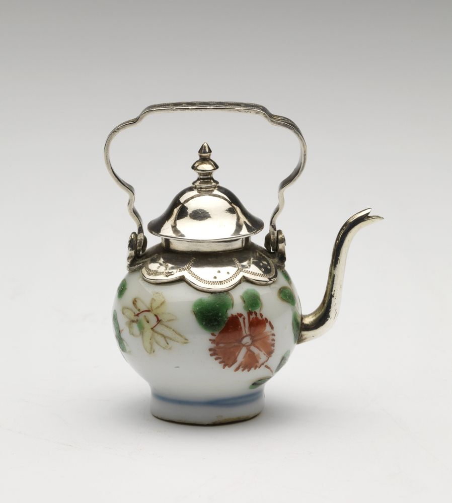 legaat 1890-03-12 inv.nr. KA 4548 in depot Theepot van gekleurd Chinees porselein met bloemmotieven en zilveren monturen.