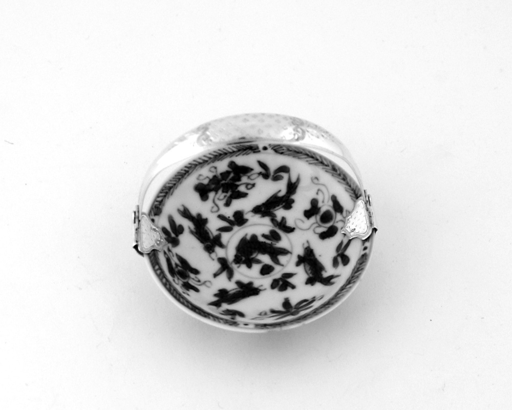 Porseleinen schotel met blauwe decoratie van vissen en bloemen en een zilveren hengsel.- Trefwoorden