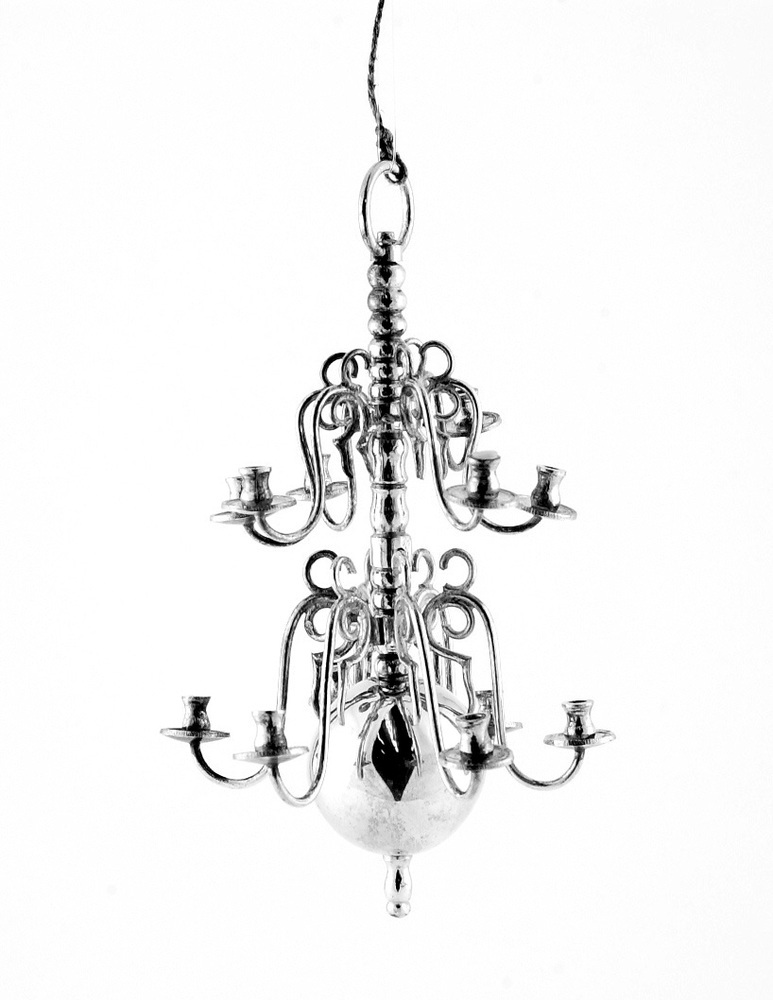 Kaarsenkroon in twee rijen van zes kaarsenhouders aan gelede stang met daaronder een bol.- Trefwoorden