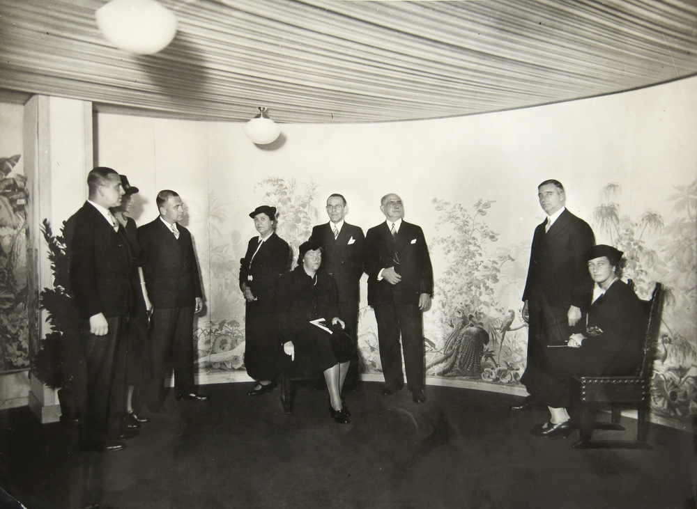 Groepsfoto gemaakt op 16 oktober 1937 ter ere van prof.dr. Heinrich Apell bij zijn 50ste persoonlijke rondleiding door de tentoonstelling 'Historische behangsels der 17e, 18e en 19e eeuw uit het Duitsche Behangselpapier-Museum te Kassel' van 4 t/m 20 oktober 1937 in de toonzalen van Rath & Doodeheefver N.V. aan de Prinsengracht te Amsterdam, 1937