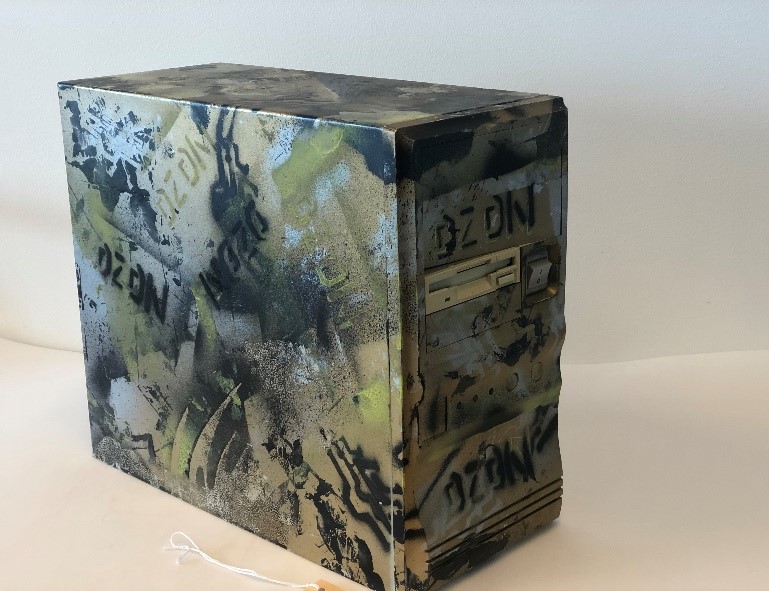 Computerkast, voorzien van camouflagekleuren en eigendomsmerk OZON, op de voorzijde een enkele 3,5 disc speler, aan en uit- en reset knop.- Trefwoorden