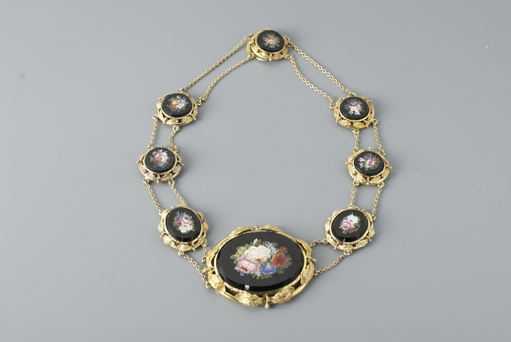 Geelgouden collier voorzien van zeven en een groot ovaal ornament, versierd met bloemmotieven in micro-mozaiek. Micro-mozaiek afkomstig uit Rome en gezet in Nederlands gouden collier.- Trefwoorden