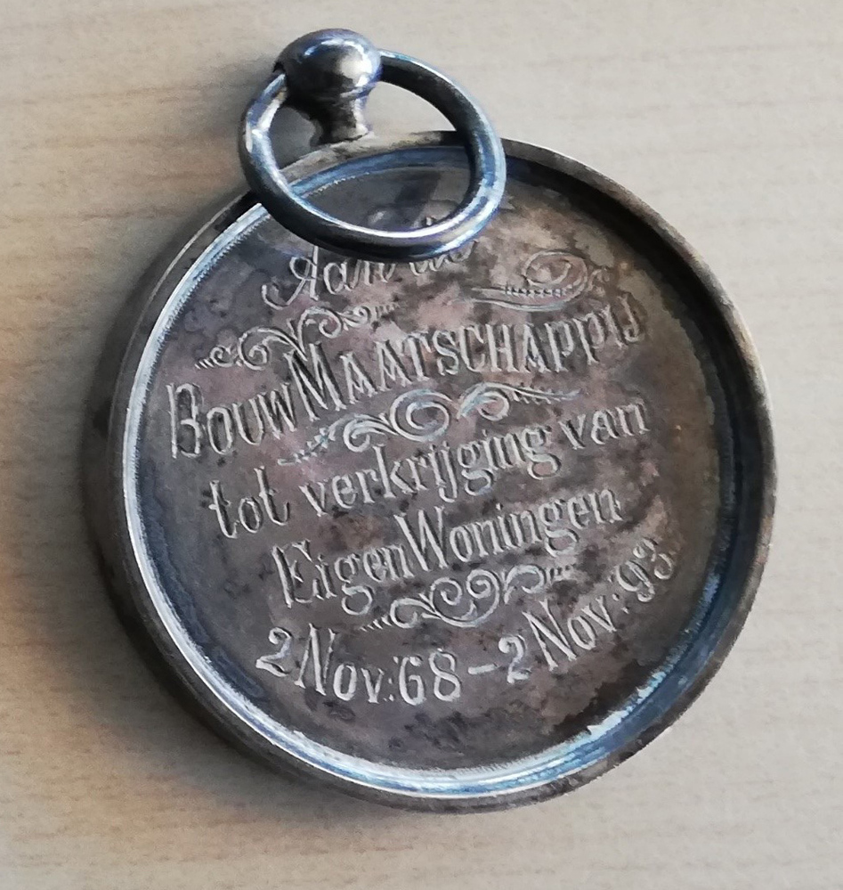 Tekst voorzijde: Aan de/ BouwMaatschappij/ tot verkrijging van/ Eigen Woningen/ 2 Nov:68 – 2 Nov:93. Tekst Achterzijde: DE VEREENIGING AMSTERDAMSCHE WERKMANSBOND.