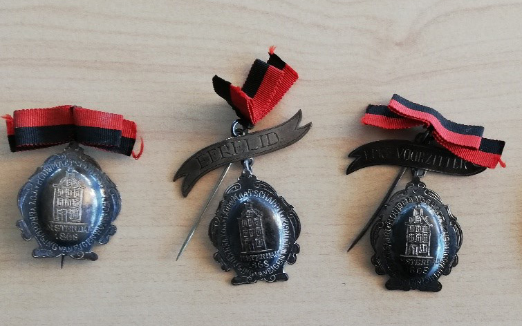 - Drie speldjes van de Bouwmaatschappij tot Verkrijging van Eigen Woningen, uitgereikt aan leden, ereleden en erevoorzitter, 1880 - 1900