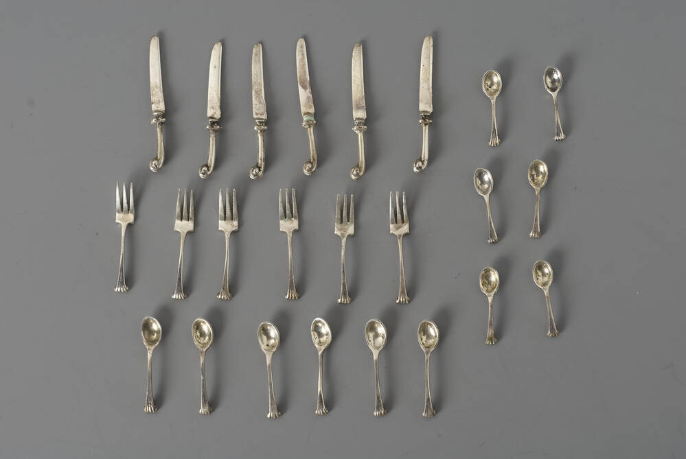 schenking 2020 inv.nr. 5622.2 in depot De eikenhouten cassette met gewelfde voorzijde en schuin deksel. De cassette bevat 6 messen, 6 vorken, 6 lepels en 6 dessertlepels.