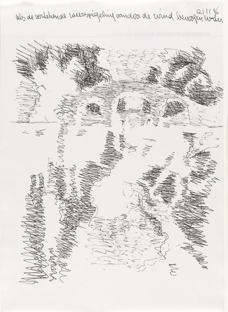 - opschrift bovenaan: onder water 21.11.96 bomen contouren wel doorzetten zodat meer afzonderlijke volumes ontstaan en er daardoor een relatie met de bogen v.d. bruggen, en dat dat gehobbel iets te maken krijgt met de boven kant v. h. park, en zich zal doorzetten in de figuren in het water en evt in reflecties