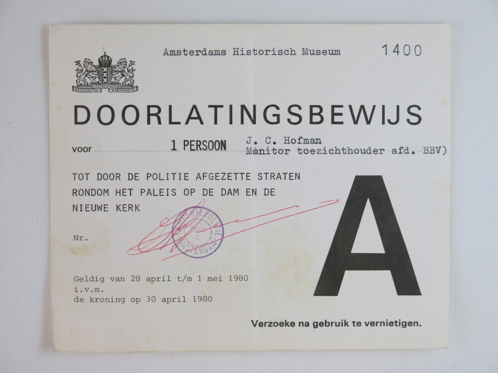 Doorlatingsbewijs tot door politie afgezette straten rondom het Paleis op de Dam en de Nieuwe Kerk, op naam van J.C. Hofman, monitor toezichthouder afd. Bureau Binnenlandse Veiligheid (BBV)