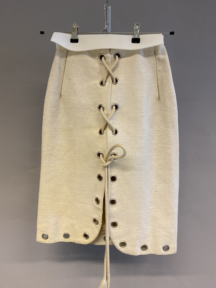 Licht gerende midi-rok van ruwe ongebleekte katoen. De hele rand is afgewerkt met zilverkleurige slagringen. Slagringen kunnen met een dik koord gebruikt worden als sluiting middenvoor. Voorpanden hebben bij de taille twee blinde steekzakken en aan de onderzijde afgeronde hoeken.