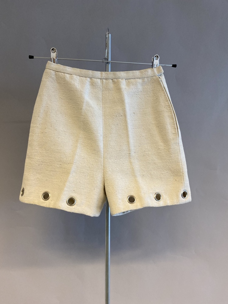 Getailleerde hotpants van ruwe ongebleekte katoen met rits in linker zijnaad. De zoom is rondom afgewerkt met zilverkleurige slagringen. Geheel gevoerd met beige polyester.