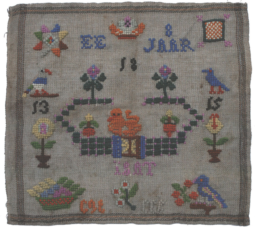 Dit kleine doekje, dat Elisabeth in 1868 voltooit, lijkt op het eerste gezicht een vrolijk werkje in aansprekende kleuren. Een ster, een kroon, een naaikussentje, bloemen en vogels, met in het hart van de doek een leeuw op het hek van een omheind tuintje. Toch is dit doekje niet alleen gezellig, het is een herdenkingsdoekje, van een meisje uit een Oranjegezinde familie. Links van het tuintje staat een papegaai op een ondergrondje. De pootjes rood, zijn buikje wit, zijn bovenlijfje blauw. Het zijn de kleuren van de Nederlandse vlag upside down. Rechts borduurt ze een blauwe vogel met rode onderdanen. Onder de vogels staan twee jaartallen, 13 en 15. In 1813 werd prins Willem Frederik, zoon van stadhouder Willem II en net terug uit Engeland, benoemd tot soeverein vorst. In 1815 wordt hij gekroond tot Koning Willem I, de eerste koning der Nederlanden uit het huis Oranje-Nassau. In 1843 overlijdt hij, 25 jaar voor de voltooiing van dit doekje. De leeuw op het hekje verbeeldt de Nederlandse leeuw in de Hollandse tuin, een symbool voor de vrijheid die veroverd werd op de katholieke Filips II van Spanje. Kaatje Eijgensteijn leert haar dochters dat het hek van de Hollandse Tuin het “wetboek van 1848”, de nieuwe grondwet voorstelt.