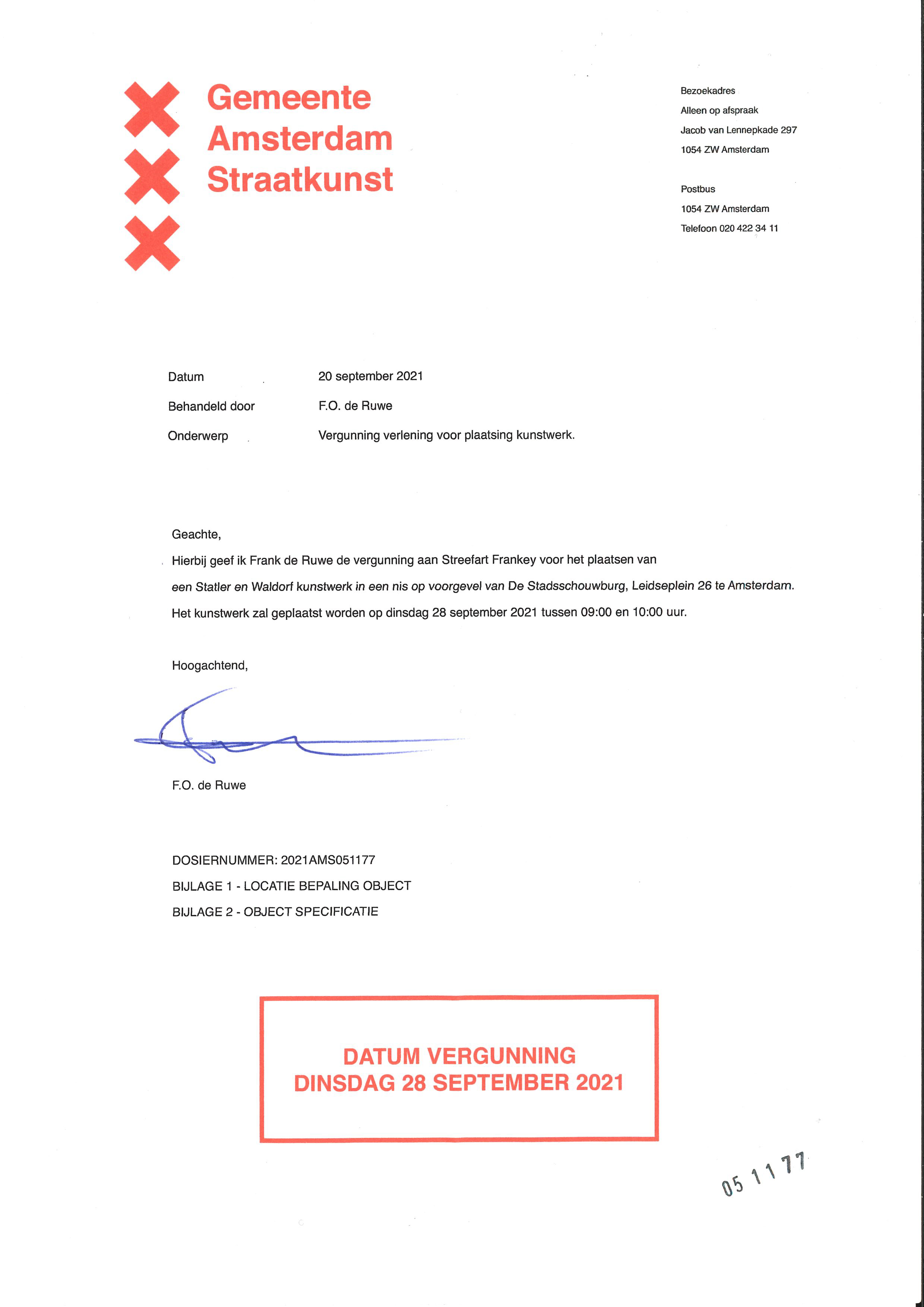 Namaakvergunning met gemeentelogo waarmee Frank de Ruwe (echte naam) aan Streetart Frankey toestemming geeft een street art-werk te plaatsen aan de gevel van de Stadsschouwburg.