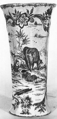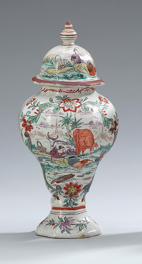 Pul met decor van koeien in de wei met herders en bloemguirlandes, geschilderd in rood, groen, geel, lila en zwart.- Trefwoorden