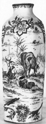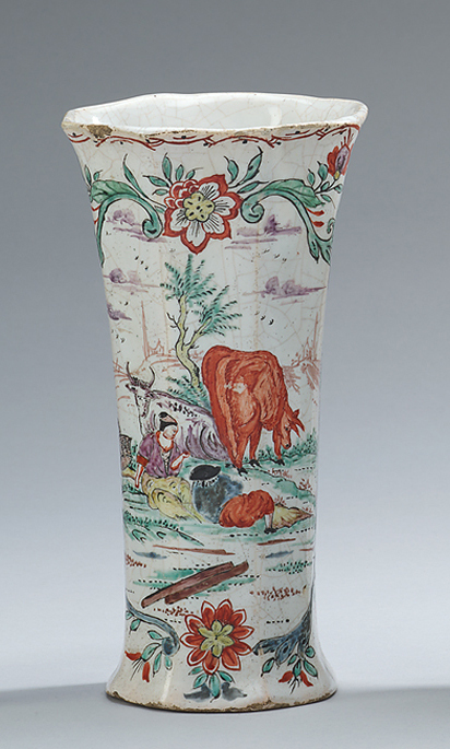 Beker met decor van koeien in de wei met herders en bloemguirlandes geschilderd in rood, groen, geel, lila en zwart.- Trefwoorden