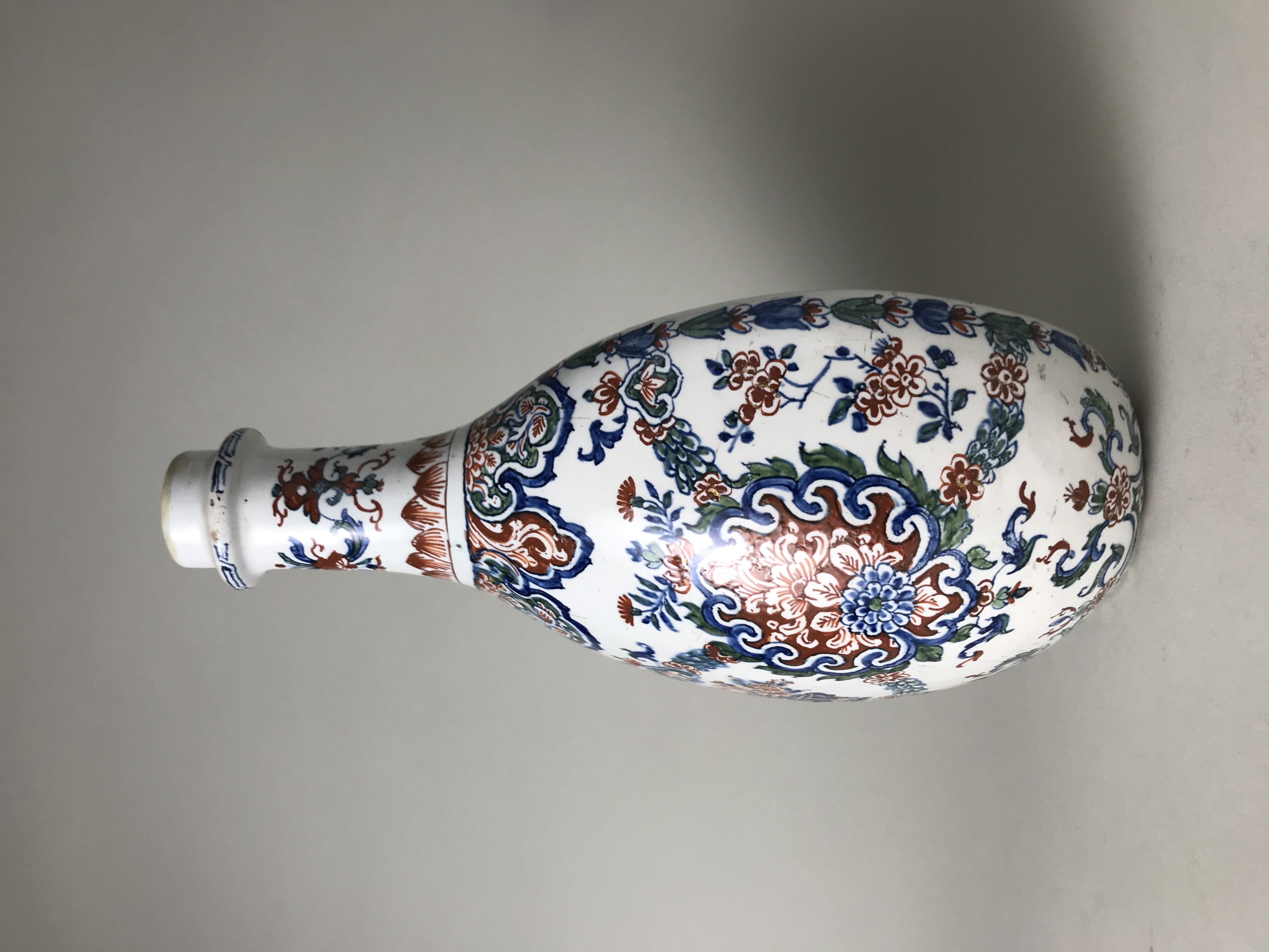 Fles met nauwe hals van stevig materiaal met een ovale buik van voren rond en van achteren plat, de bodem is afgeslepen. Het geheel is versierd in roodbruin, groen, blauw en wat goud (is afgesleten) met een veelkleurig Japans bloempatroon, rondom vogels en vlinders.- Trefwoorden