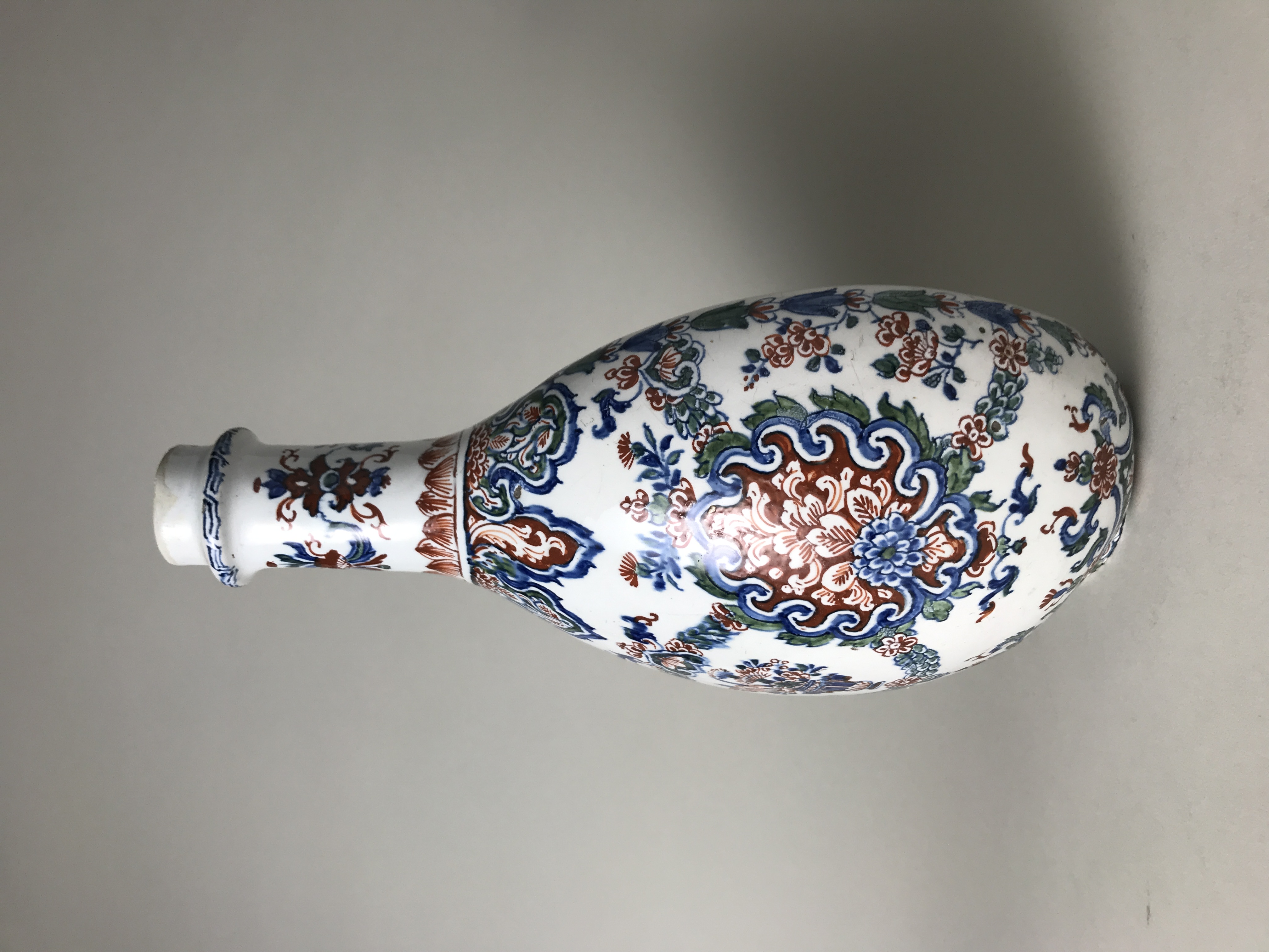 Fles met een nauwe hals van stevig materiaal met een ovale buik van voren rond en van achteren plat, de bodem is afgeslepen. Het geheel is versierd in roodbruin, groen en blauw en wat goud (is afgesleten) met veelkleurig Japans bloempatroon, rondom vogels en vlinders.- Trefwoorden