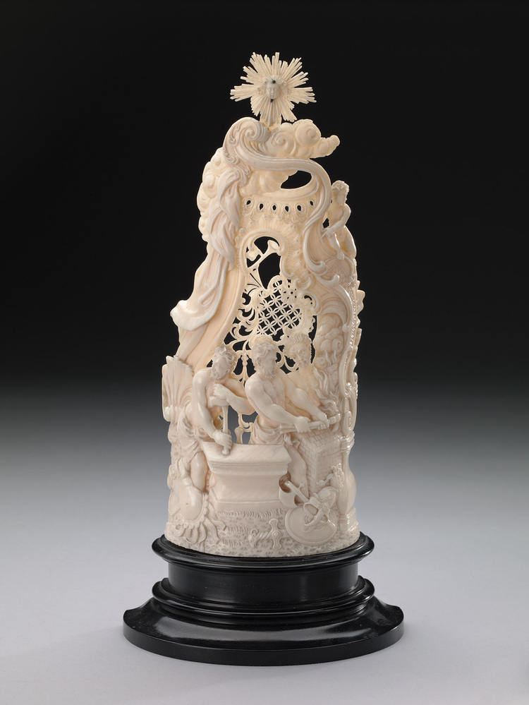 De verzameling van Abraham Willet telt een groot aantal voorwerpen van gesneden ivoor. Deze decoratieve reeks heeft als onderwerp de vier elementen: Water, Lucht, Aarde en Vuur. Links is de zeegod Neptunus weergegeven, hij symboliseert het water. Dan volgt Zeus, de heerser over het hemelrijk en daarmee de lucht. Derde in de rij is Ceres, die als godin van de vruchtbaarheid de aarde representeert. De Cyclopen, smeden van de godheid Hephaistos, symboliseren het vierde element: het vuur. ( Bert Vreeken)