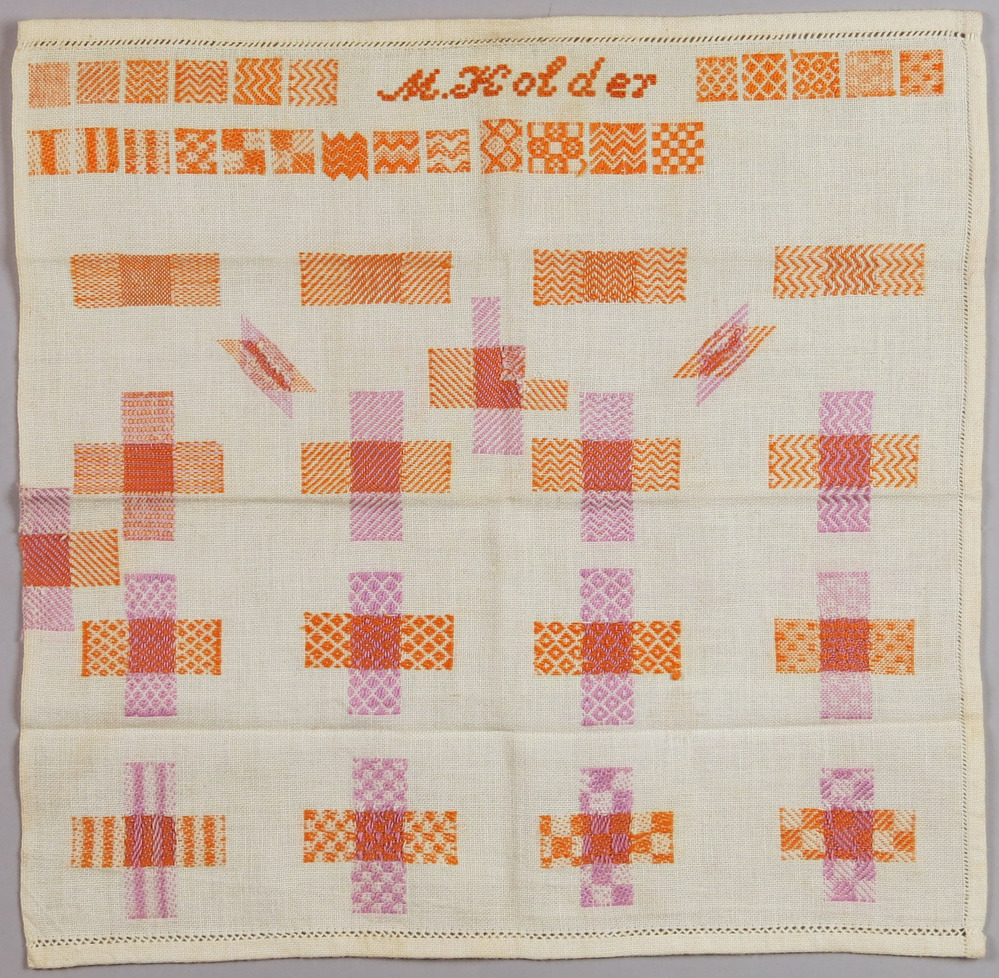 Voor deze doek heeft Wilhelmina hetzelfde patroon gebruik als zus Adriana voor haar. Beide doeken hebben bovendien hetzelfde formaat van 35 bij 35 cm. De meisjes openen hun werk met twee regels van samen 26 kleine doorstopjes, waar verschillende motiefjes in uitgewerkt zijn. In de bovenste regel is ruimte uitgespaart voor hun naam. Wilhelmina gebruikt daarbij niet haar doopnaam, maar kiest voor de M van Mientje. Daaronder volgen vier langgerekte doorstopjes. Het resterende deel van de doek is verdeeld in drie rijen van vier kruisstoppen. Ook hier ontstaan patroontjes in de kruisarmen. De strookjes en de kruisstoppen worden gescheiden door twee vlinderstoppen met daartussen een winkelhaakstop.