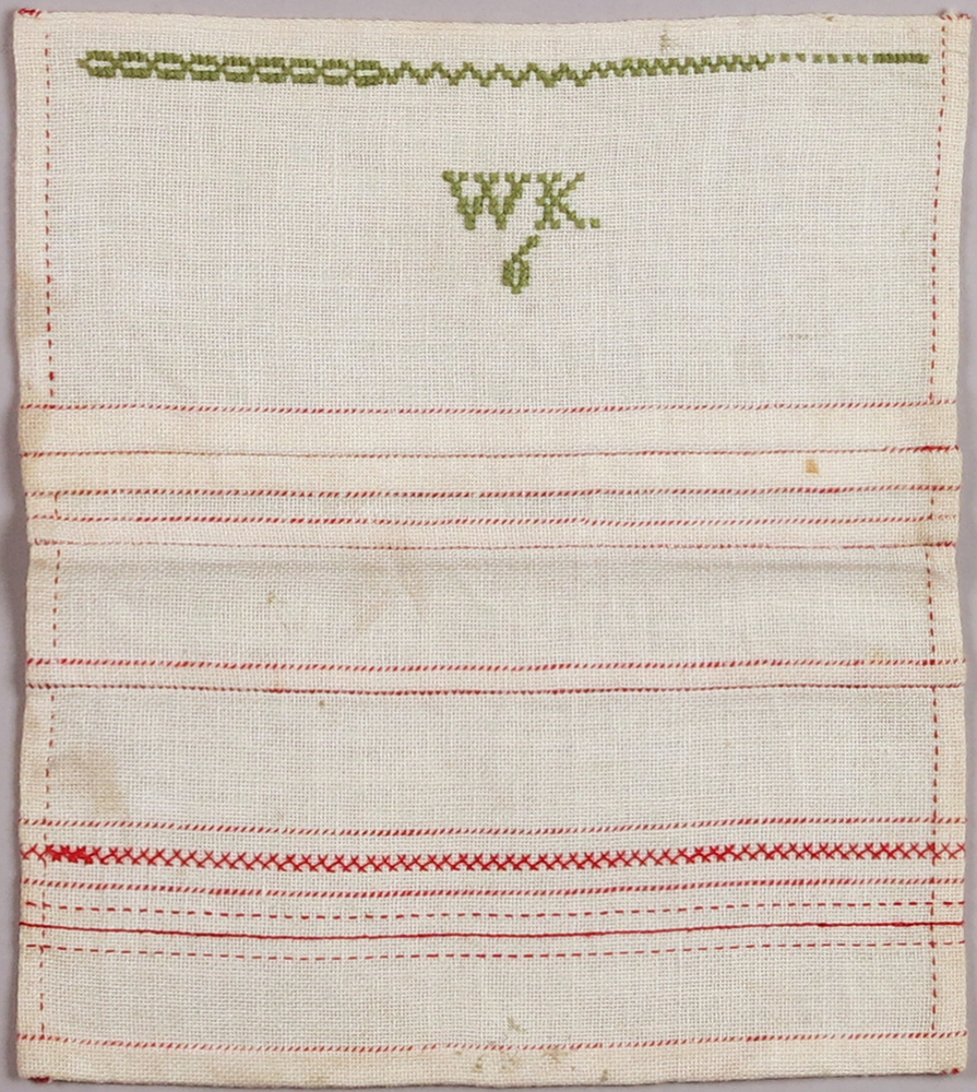 opschrift bovenkant, gecentreerd: WK. / 6: inialen van borduurster