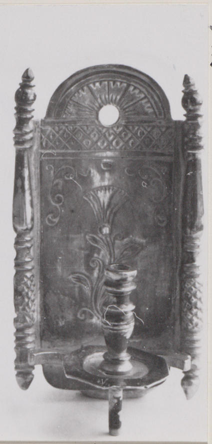 Wandblaker in renaissancestijl met hol gegegraveerd bord en een kaarsenhouder.- Trefwoorden