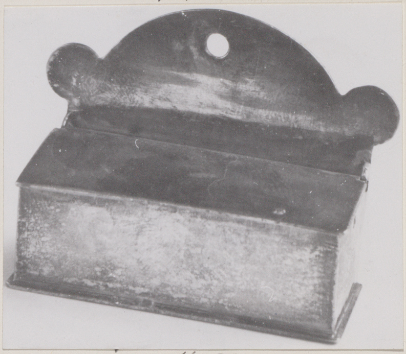 Rechthoekige bak met klep, de muurplaat verhoogd met ophangoog en hoog getoogd met twee oren.