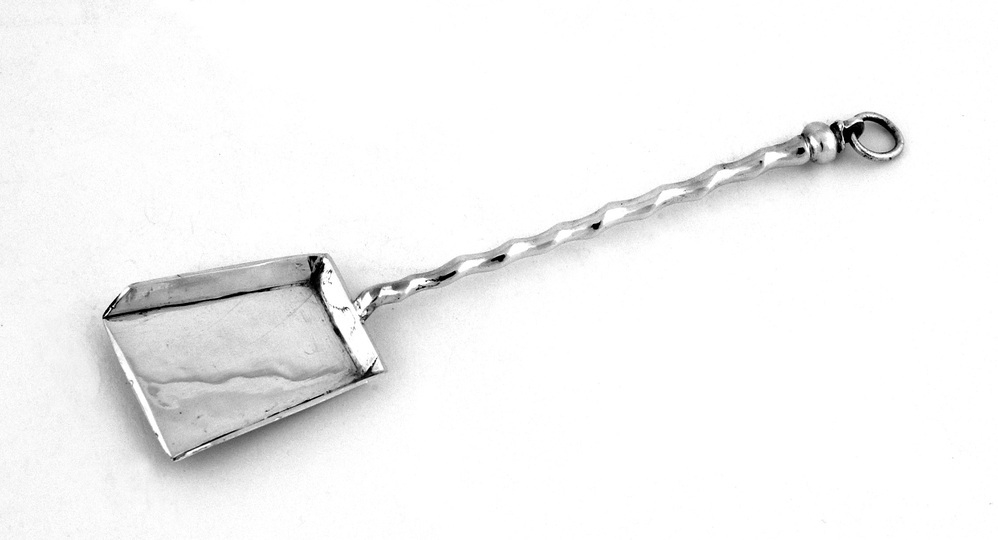 Vlakke schep met getortse steel en ophangring.- Trefwoorden