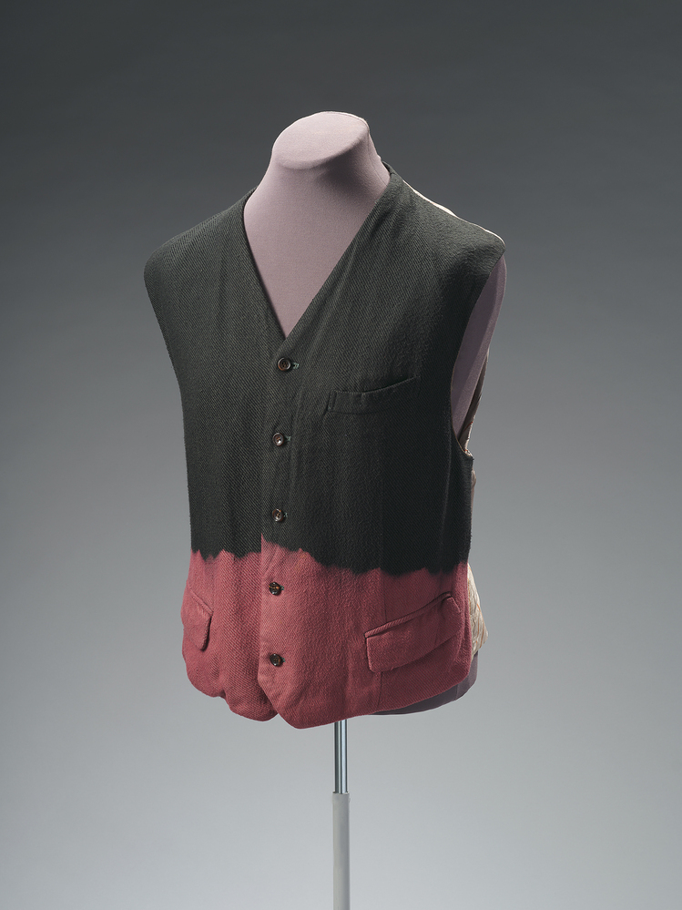 Gilet van het merk ‘Comme des Garçons HOMME PLUS’ voor de AW ‘93/’94 collectie. Op 29 januari 1993 showde Comme des Garçons (onder Rei Kawakubo) de collectie ‘The Artist in his Studio’ in Carreau du Temple in Parijs – mogelijk de eerste collectie die Kawakubo heeft betiteld. De collectie toonde verschillende herenkleding in dip-dye bleach-techniek, gedragen door verschillende type kunstenaars, waaronder Neo-Dada kunstenaar Robert Rauschenburg. De modellen waren er in allerlei maten en leeftijdscategorieën – in die tijd een uitgesproken keuze. Deze gillet is een van de creaties onder deze collectie. In dit gilet is door de dip-dye-bleach-techniek de onderkant roze, waardoor een kleurcontrast ontstaat met de zwarte/donkergrijze bovenkant.