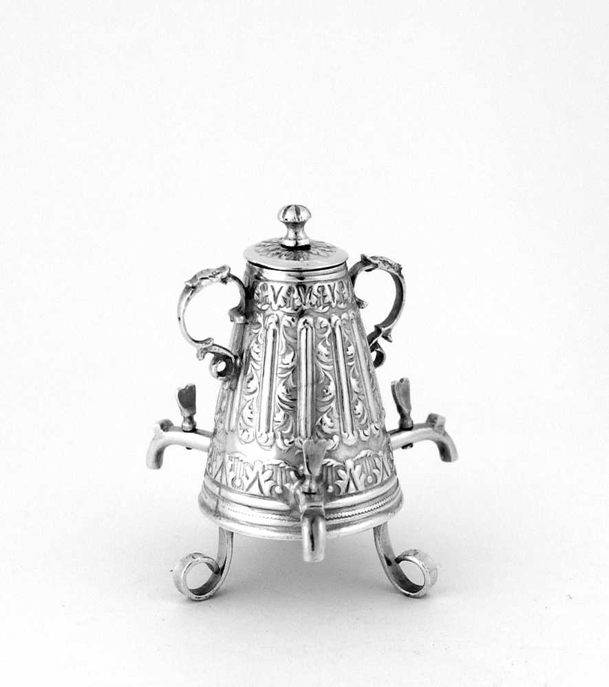 Bewerkte kan op drie pootjes, drie kranen en twee oren en een los deksel- Trefwoorden