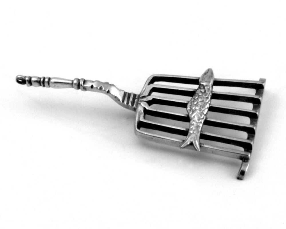 Treeft op drie poten, rooster van zes spijlen, dubbelgebogen steel eindigend in een pilastervormig heft en voorzien van oog en smalle lange vis (mogelijk snoek).- Trefwoorden