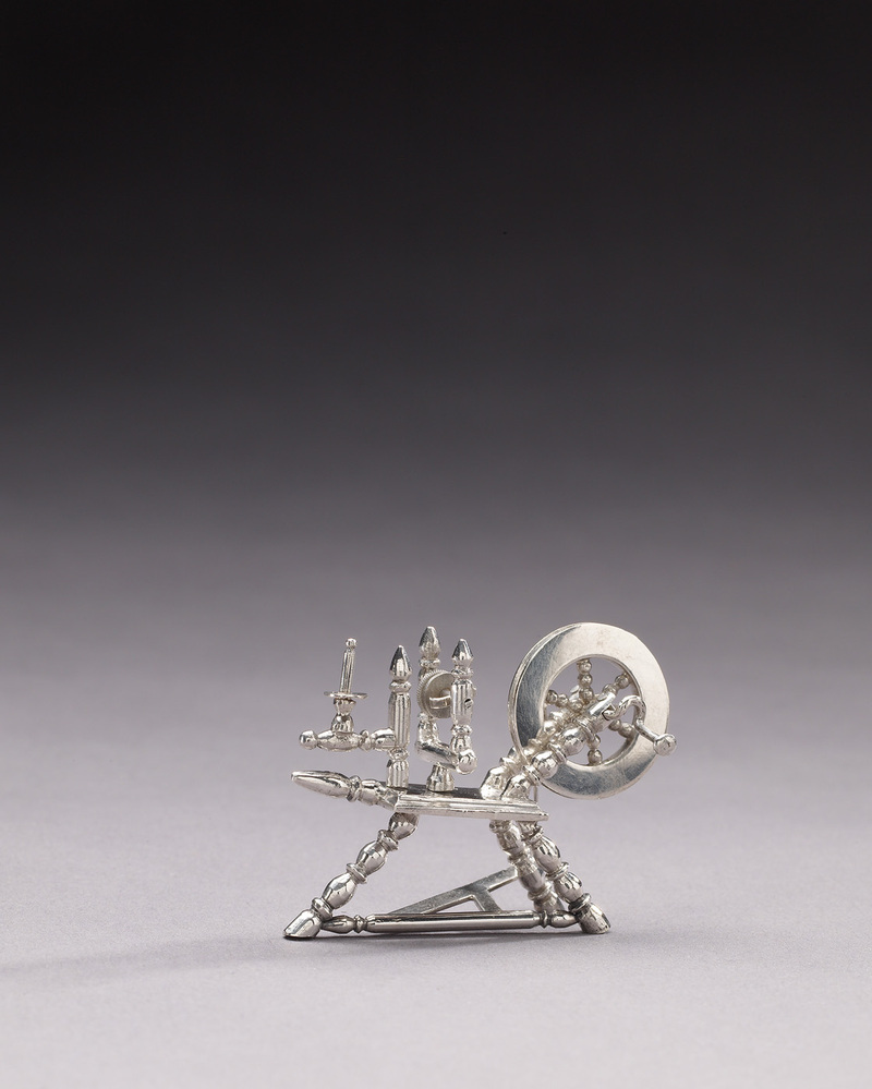 Toestel met drie gedraaide poten met hierop een wiel gekoppeld aan een pedaal met klos en spoelhouder.