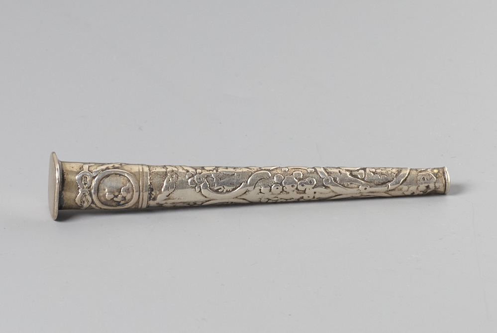 Ronde naaldenkoker met schroefdop en rijgnaald.- Trefwoorden