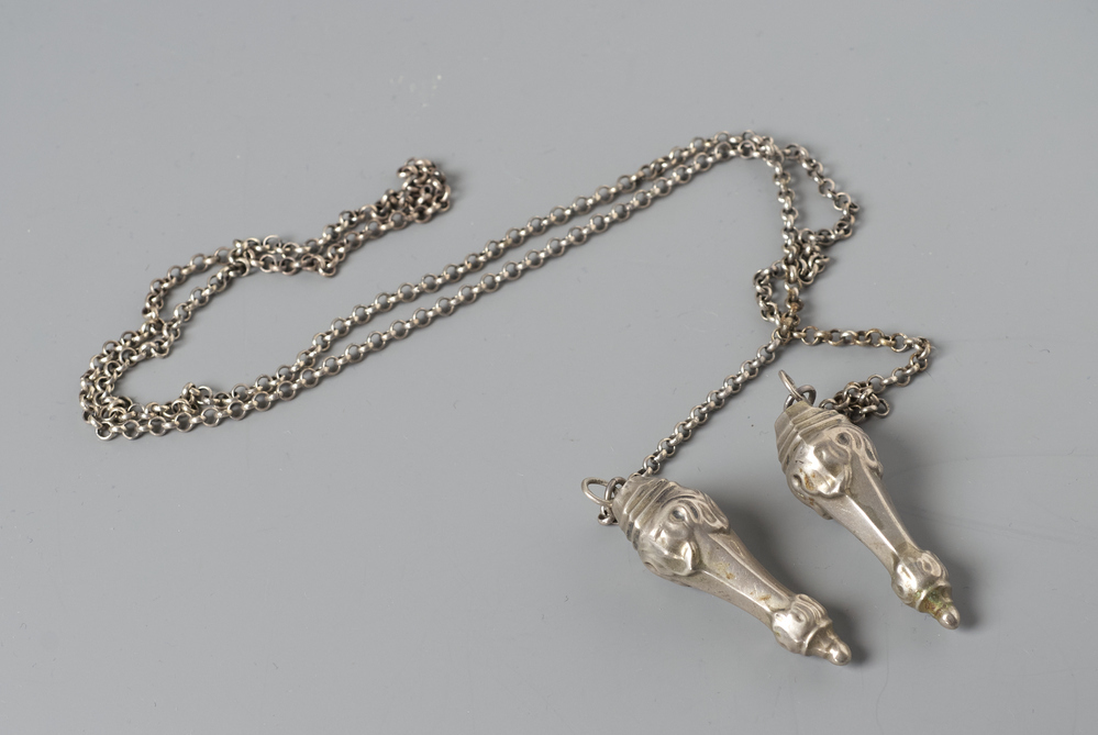 Twee balustervormige puntbeschermers aan een ketting.- Trefwoorden