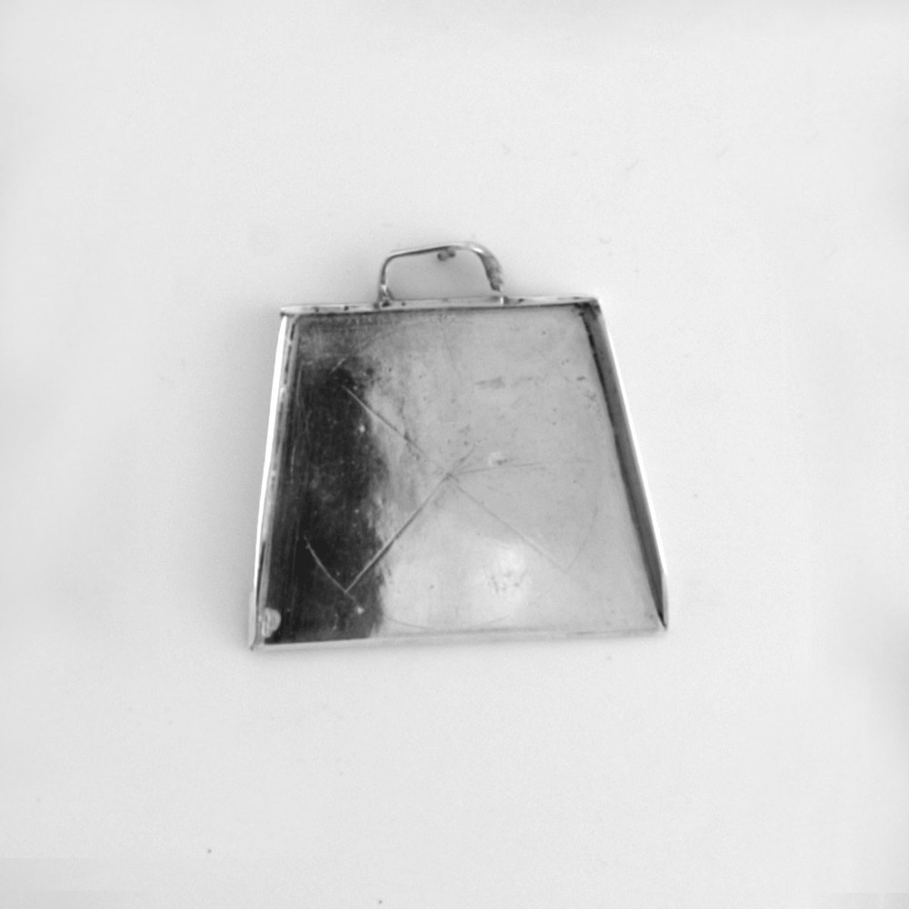 Trapeziumvormig blik met vlakke bodem en drie opstaande vlakke randen, waarvan het middendeel op de hoeken is gegolfd, U-vormige greep, bovenzijde blik met gegraveerde cirkel met lijnverdeling.