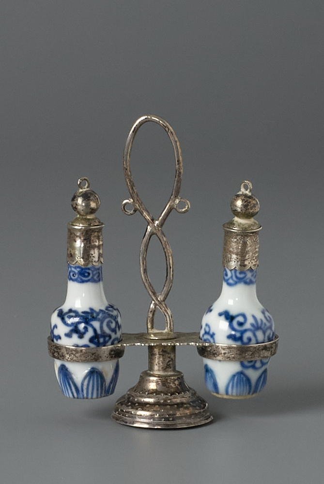 Twee Chinese vazen vermaakt mbv. zilveren monturen tot een olie- en azijnstel.- Trefwoorden