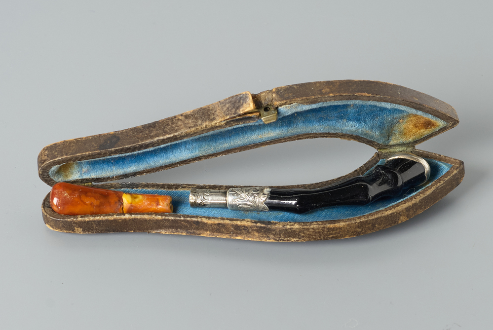 Kleinmodel sigarettenpijpje in de vorm van een paardenbeen met hoefijzer en zilver tussenstuk met barnsteen mondstuk, in een in vorm gemaakt doosje.- Trefwoorden