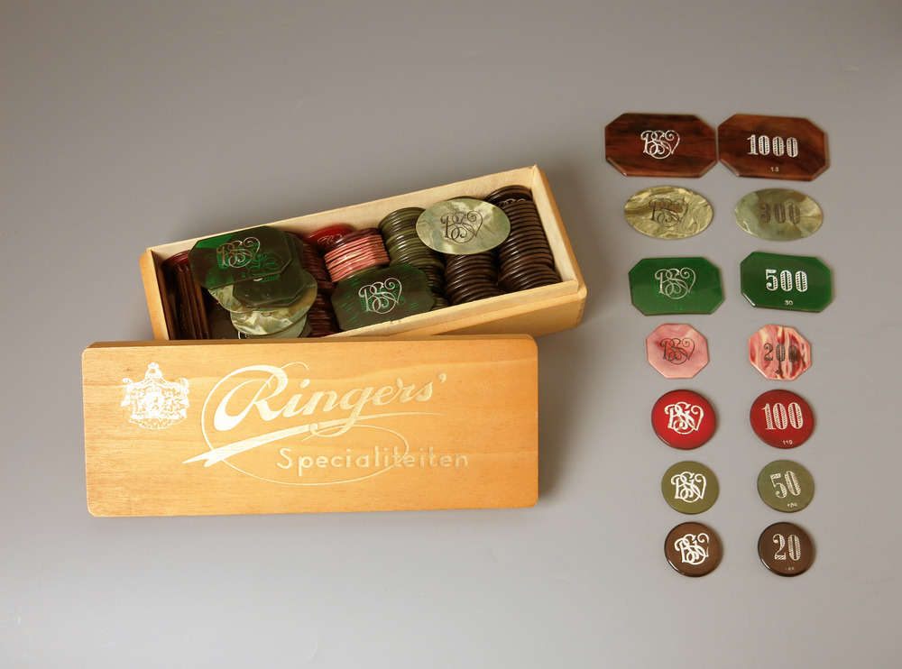 Doos met opdruk "Ringers/specialiteiten" waarin speelfiches in verschillende vormen en kleuren, die daarmee verschillende waarden weergeven: 1000, 500, 300, 200, 100, 50, 20. Alle speelfiches hebben aan weeerzijde de intitalen BSV.- Trefwoorden