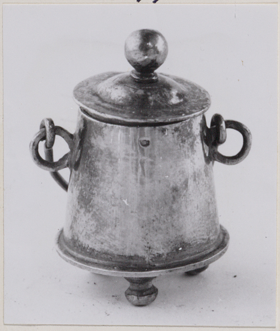 Ronde conische emmer op drie pootjes, met een deksel en hengsel