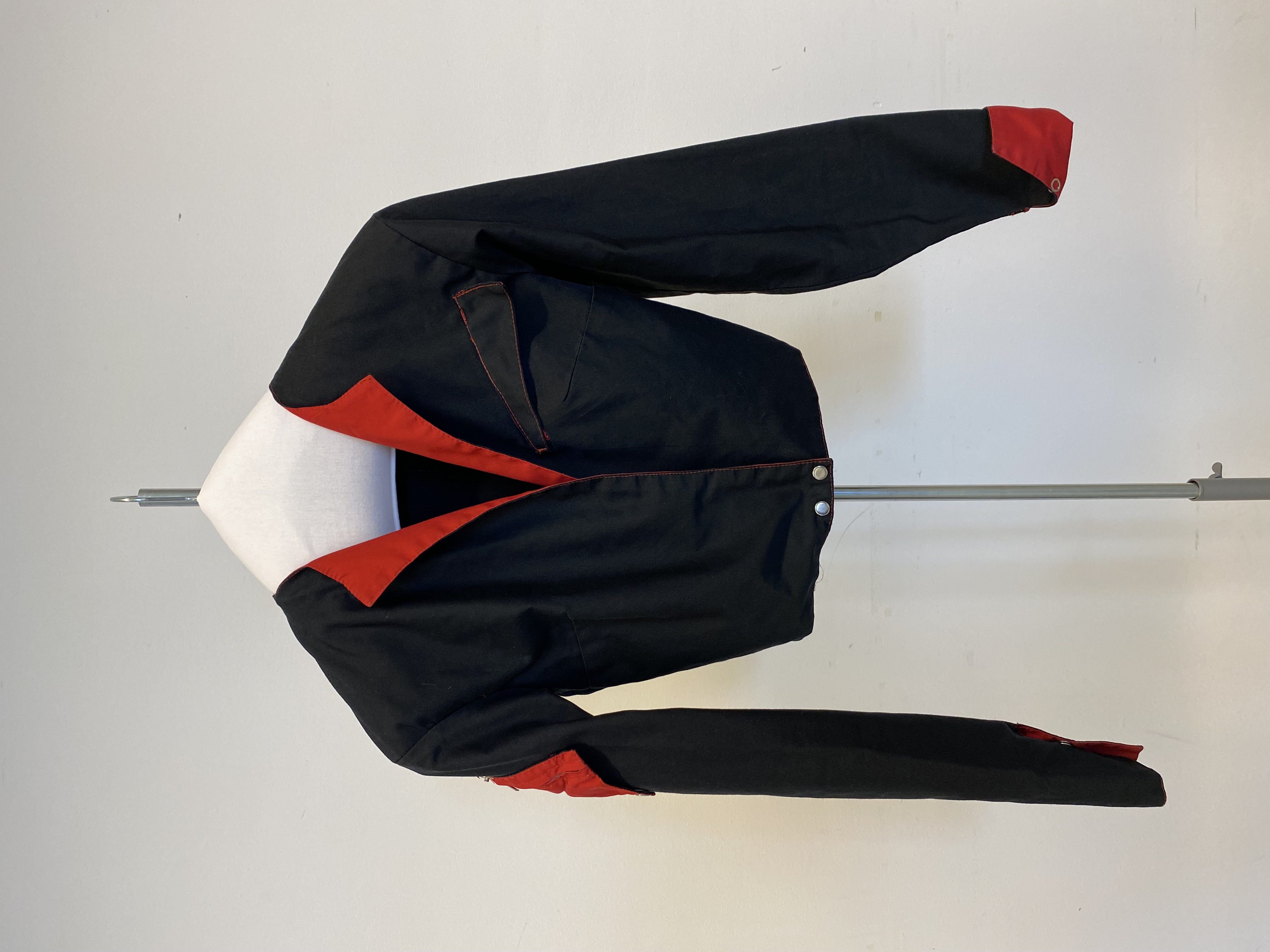 Kort getailleerd kraagloos jasje met lange mouwen. Uitgevoerd in zwart met rode details. Aangenaaide revers met rood beleg. Sluiting door middel van twee drukknopen middenvoor onderaan. Linkerborstzak met opgestikte klep en rode voering. Op de rechtermouw een decoratief zakje met rits en drukknoop. Onderzijde mouwen een splitje met rood beleg. Sluiting door middel van drukknoop.