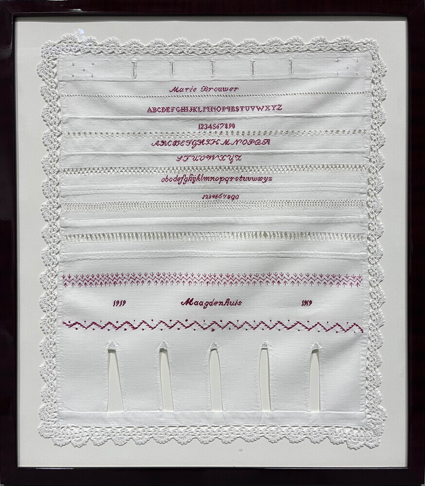 Marie of Rietje is de dochter van Jan Brouwer (1864-1913), een Friese kleermaker en Maria Agatha Misch (1865-1908). Er worden negen kinderen in dit gezin geboren: vier jongens en vijf meisjes. Leentje hoort met haar zusjes Cecilia (1901-1981) en Helena (1903-1993) bij de kleintjes. Kort nadat hun moeder wegvalt, krijgt vader Jan een nieuwe relatie. Als ook vader overlijdt worden Ceciel, Leentje en Rietje in het ‘Roomsch Catholijk Maagdenhuis’ voor weesmeisjes op ’t Spui geplaatst. Hun stiefmoeder houdt contact met de meisjes en steunt het Maagdenhuis financieel. De oudste zus Johanna Maria Theresia, vindt haar eigen weg en komt in het handwerkonderwijs terecht. Op ’t Spui leren de gezusters handwerken. Rietje wordt huishoudster. Ze blijft ongehuwd. Op 23 december 1892 overlijdt ze in Amsterdam. De schenkster van deze doek is de schoondochter van Cecilia Maria Brouwer. Met dit nadenlapje worden verschillende technieken geoefend, kantjes, al dan niet opengewerkte sierranden, het maken van knoopsgaten en het aan elkaar zetten van losse strookjes stof. Elke strook werd benut om alfabetten en cijferreeksen te borduren. Aan de bovenzijde heeft Rietje haar naam achtergelaten aan de onderzijde tweemaal het jaar van voltooiing, 1919 en de naam van het weeshuis. Ze werkte met rood garen op witte katoen. De doek meet 56,5 x 49,5 cm met rand en 47,5 x 40,5 cm zonder rand. Mogelijk heeft zij het kanten randje zelf geklost of gehaakt met een uiterst fijne haaknaald. Dat Rietje een nette handwerkster is, blijkt uit het feit dat de doek hagelwit is gebleven.