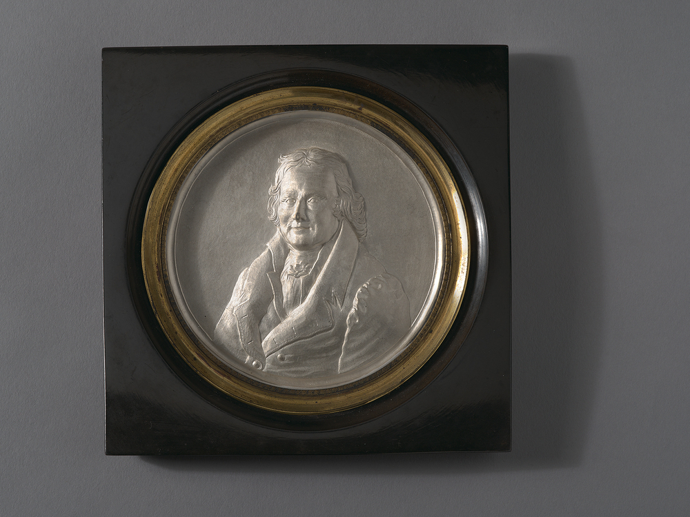 Rond, zilveren reliefportret in vierkant houten lijstje.- Trefwoorden