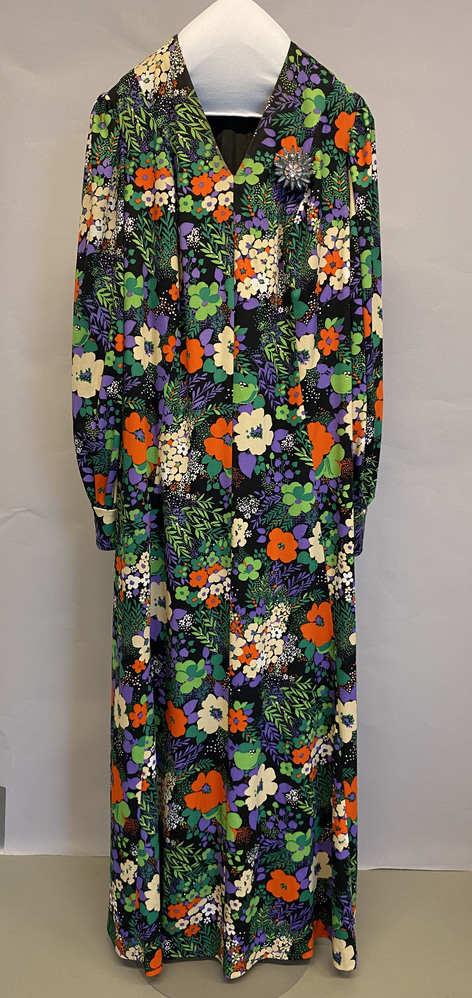Lange wijdvallende gebloemde japon met A-lijn, v-hals en lange mouwen met manchetten. Met op linkerborst een ronde strass broche.