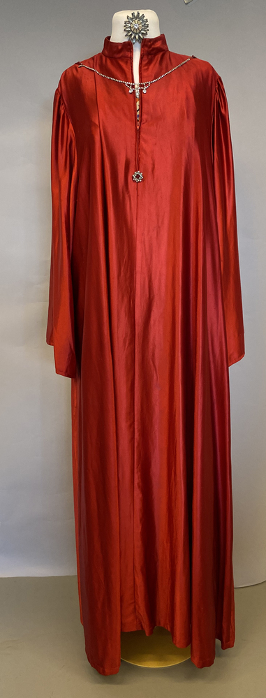 Lange wijdvallende rode japon met ritssluiting voor en opstaande boord. Met aangerimpelde wijde mouwen en strass decoraties rond de rits.