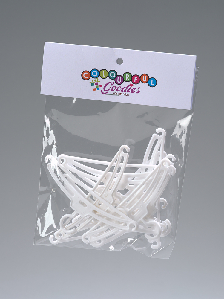 Ca. 10 wit plastic hangertjes in plastic zakje. Op papieren sluiting met nietje is de naam en reclame voor Colourful Goodies gedrukt.- Trefwoorden